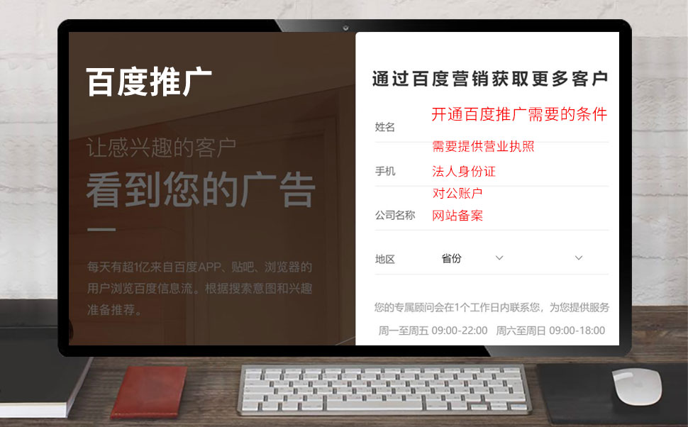 百度推广可以为企业网站带来精准的客户,企业要想取得良好效果,就要做一个好的营销型网站,做好网站维护管理、网上咨询服务、电话销售等方面的相应配套的服务人员,只有这样才能让百度推广为您带来的潜在客户成功转化成交订单。可以找攻硬营销全网营销专业为您的企业建设一个高转化的优质营销型网站,让你的推广效果成倍放大。那企业开通百度推广需要什么条件呢?